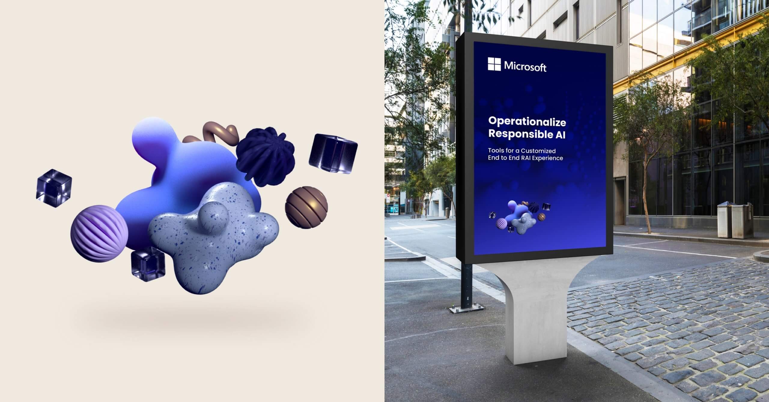 With the look and feel of the site we wanted to create something that would cater well to late night coding sessions and the ever more common dark mode beloved in the developer community. Welcoming and innovative was the objective, and not abrasive or heavy. Microsoft’s brand tones were helpful to lean in to being welcoming and calming, shifted in high gear to a neon palette with a hunt of fuschia to bring a fresh energy to the experience. The illustrative approach. brought an added angle to the creative, with abstract orbs and cylinders hovering together to present a beautiful view of our interconnected, data-driven, A.I.-fueled future through incredible 4d renderings.